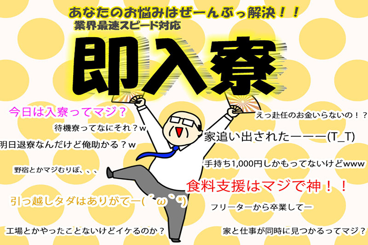 ・生活基盤を整えつつ、体を動かしてしっかり稼げます!アピールポイント 寮完備で即入寮OK、入寮までホテル対応あり!